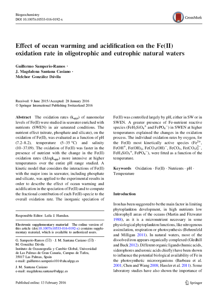 - Guillermo Samperio-Ramos, J. Magdalena Santana-Casiano, Melchor Gonzalez-Davila. 2016. Effect of ocean warming and acidification on the Fe(II) oxidation rate in oligotrophic and eutrophic natural waters.Biogeochemistry. DOI 10.1007/s10533-016-0192-x.
